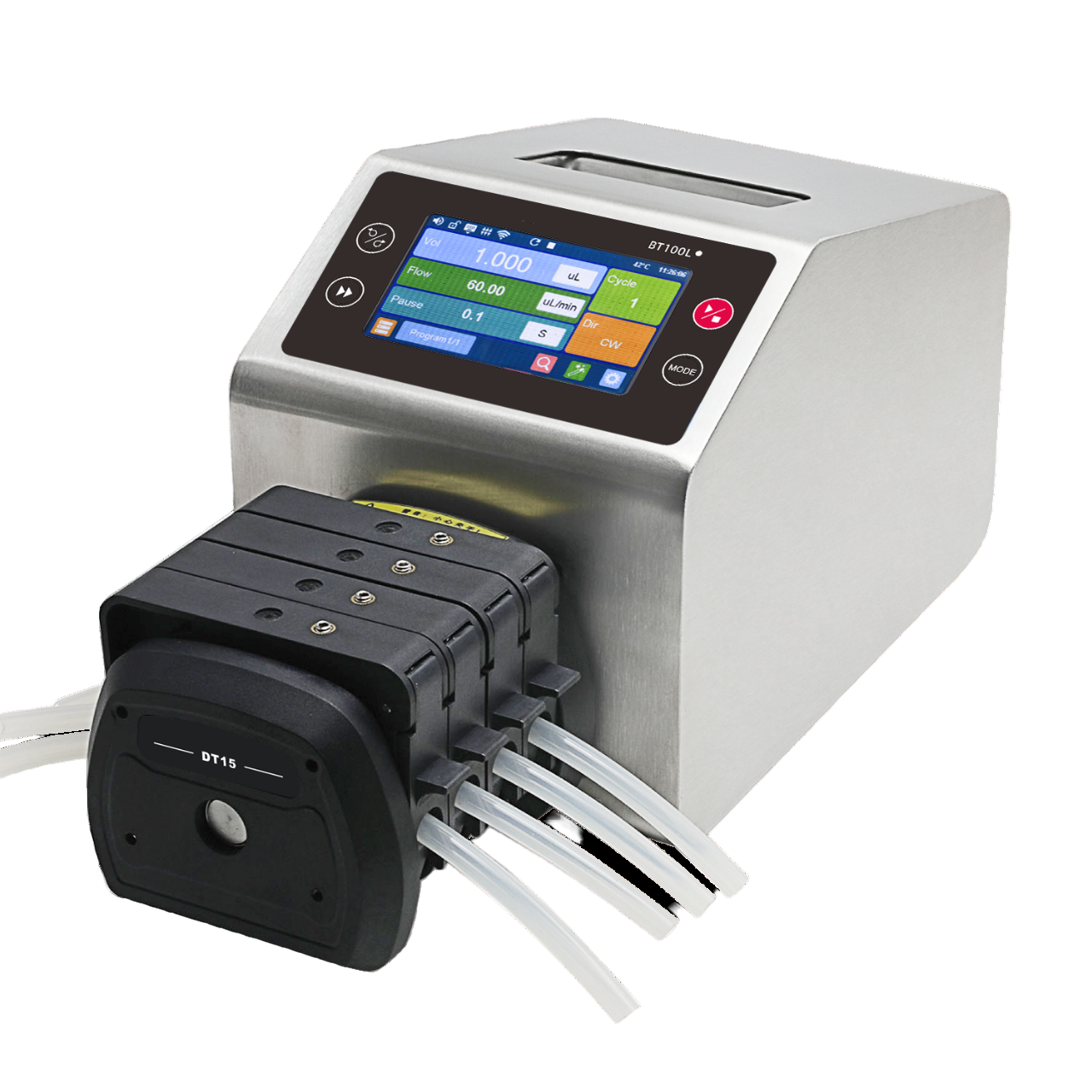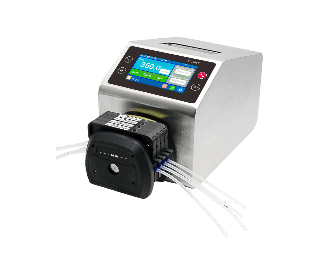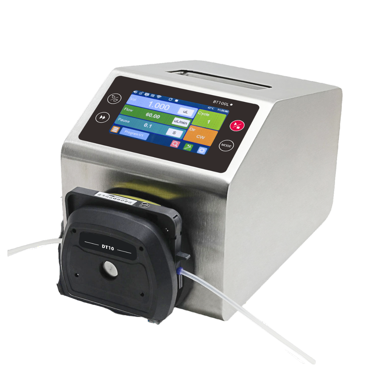 Die intelligente Dosierpumpe BT100F ist ein vielseitiges und benutzerfreundliches Gerät mit einem Durchflussbereich von 0,0002 bis 720 mL/min, abhängig von Pumpenkopf und Schlauch. Die Pumpe verfügt über einen farbigen LCD-Touchscreen und bietet vier Betriebsmodi: Volumendosiermodus, Zeitdosiermodus, Programmierbarer Dosiervorgang und Durchflussmodus. Dank der RS485 MODBUS-Schnittstelle kann die Pumpe problemlos mit externen Geräten wie PC, HMI oder SPS kommunizieren.