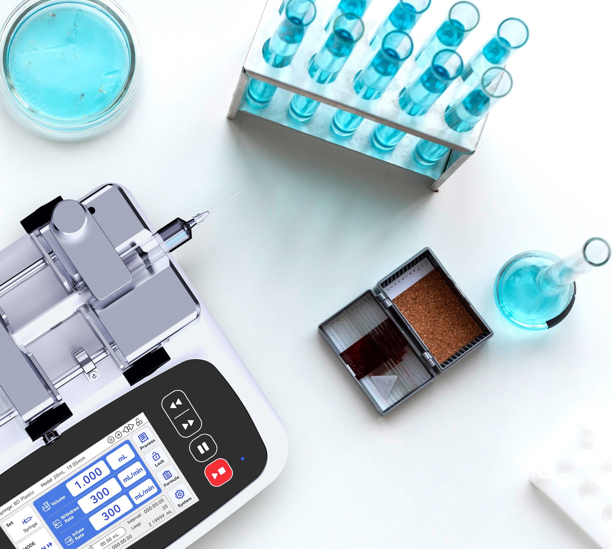 The LAA-01 syringe pump is designed to accommodate syringes ranging from 10 μL to 60 mL, offering a flow range of 0.184 nL/min to 83.318 mL/min. Its 4.3" HD LCD touchscreen allows easy parameter configuration, monitoring of various working modes, and selection of syringes from different manufacturers and specifications. The pump ensures high-precision control and incorporates protective measures and alarm systems.